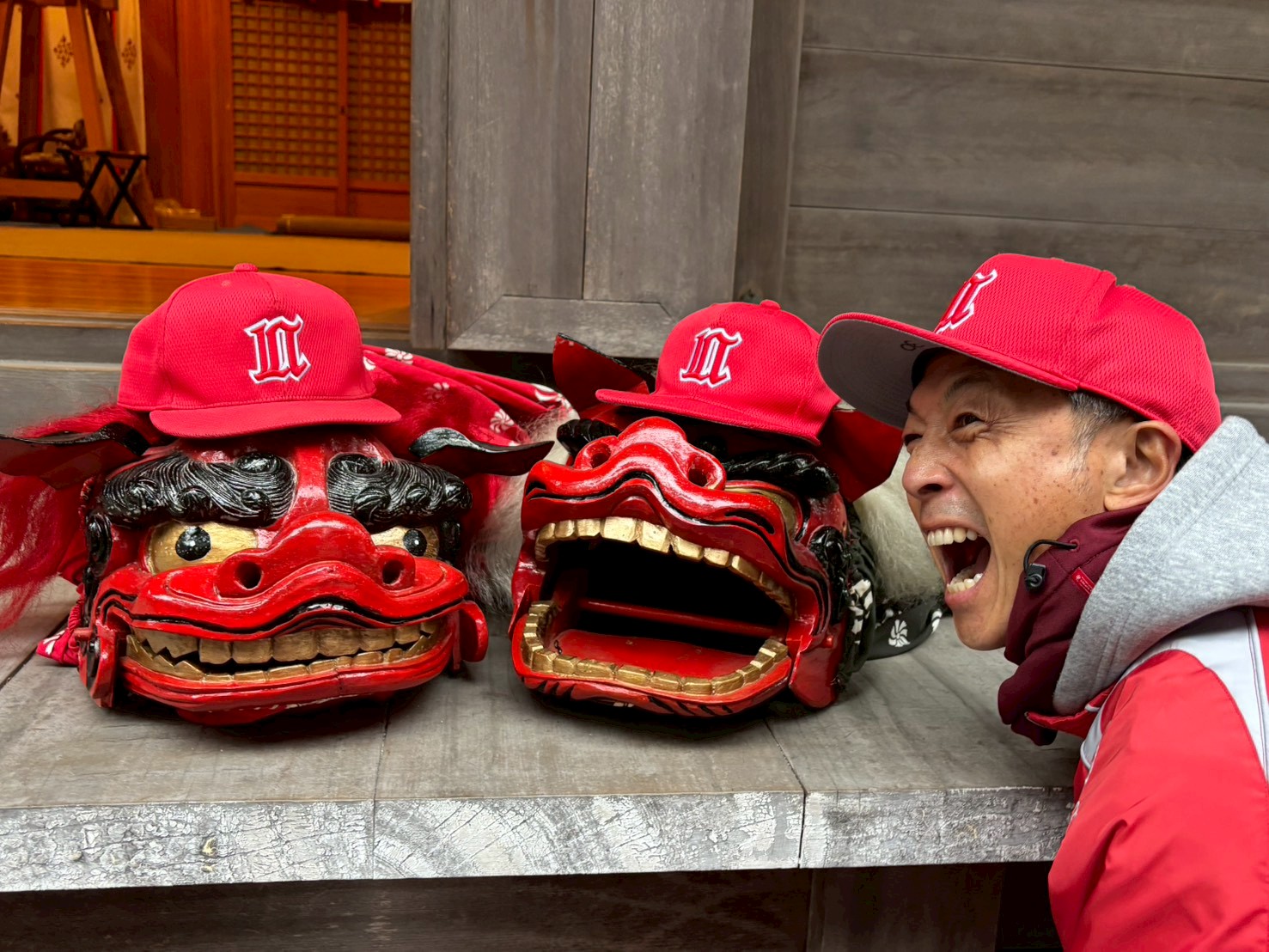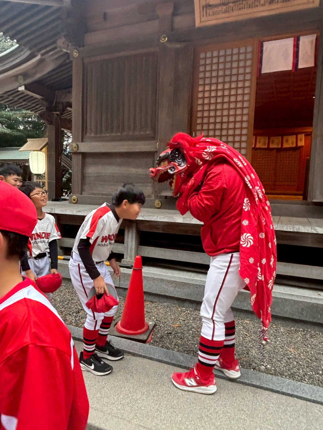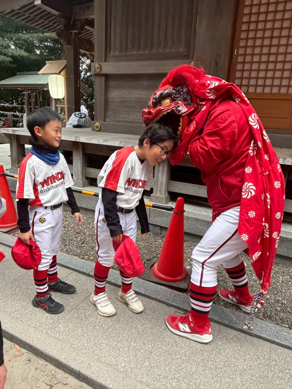 今年も一年、子供達全員が元気に成長できるよう祈願し、たまたま鉢合わせた?獅子舞さんにも頭を噛んでもらい「邪気払い」もできました。